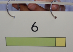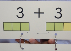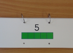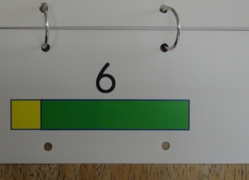 合成は、1と1で2、1と5で6…というように10までの数の組み合わせがタイルもあわせて表記されており、カードをめくりながら学べます。また、こちらのカードの特徴は上下に穴が開けられており、リングを付け替えることで2は1と1、5は3と2…などというように、数の分解もカードの表と裏を上手く使いこなすことで、10までの数の合成と分解の2通りを学習できるフラッシュカードとなっております。