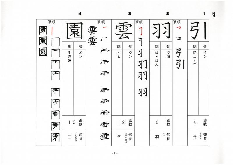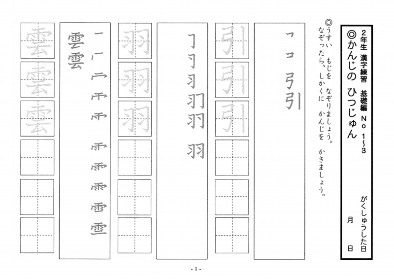 各学年で習う配当漢字の筆順を練習します。筆順を上からなぞったら、横の6つのしかくの中に1回ずつ漢字を書いていきます。上の3つは漢字をなぞり、下の3つは漢字の字形を意識しながら自分で書いて練習します。