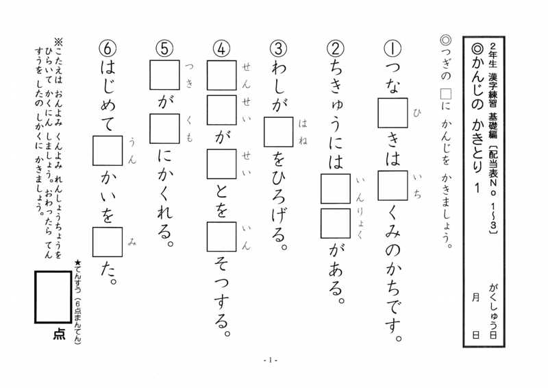 音読み訓読み練習帳に掲載されている例文が書き取りの問題集に。例文に使用されている漢字は全て書き取りの問題となっているので、新出漢字と、これまで習った漢字の復習も同時に行えます。1ページあたりの問題数は5~6問と短時間での学習も可能。毎日やるもよし、週末にまとめてやるもよし。これまでの学習の成果が試されます。
