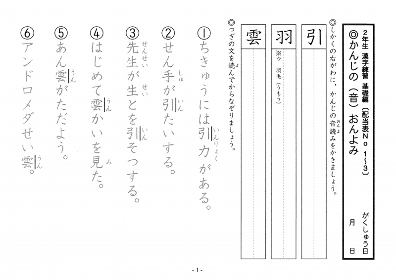 音読み訓読み練習帳に掲載されている例文が書き取りの問題集に。例文に使用されている漢字は全て書き取りの問題となっているので、新出漢字と、これまで習った漢字の復習も同時に行えます。1ページあたりの問題数は5~6問と短時間での学習も可能。毎日やるもよし、週末にまとめてやるもよし。これまでの学習の成果が試されます。